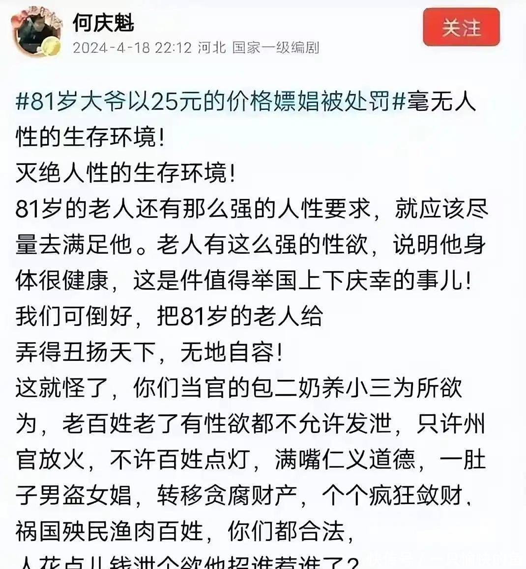 对于这件事,何庆魁并未给出直接的、正面的回应。有网友深挖发现,何庆魁曾在公开场合针对嫖娼这一现象发表过看法,其言辞极为激烈。最后结尾以道德婊子四字痛骂。